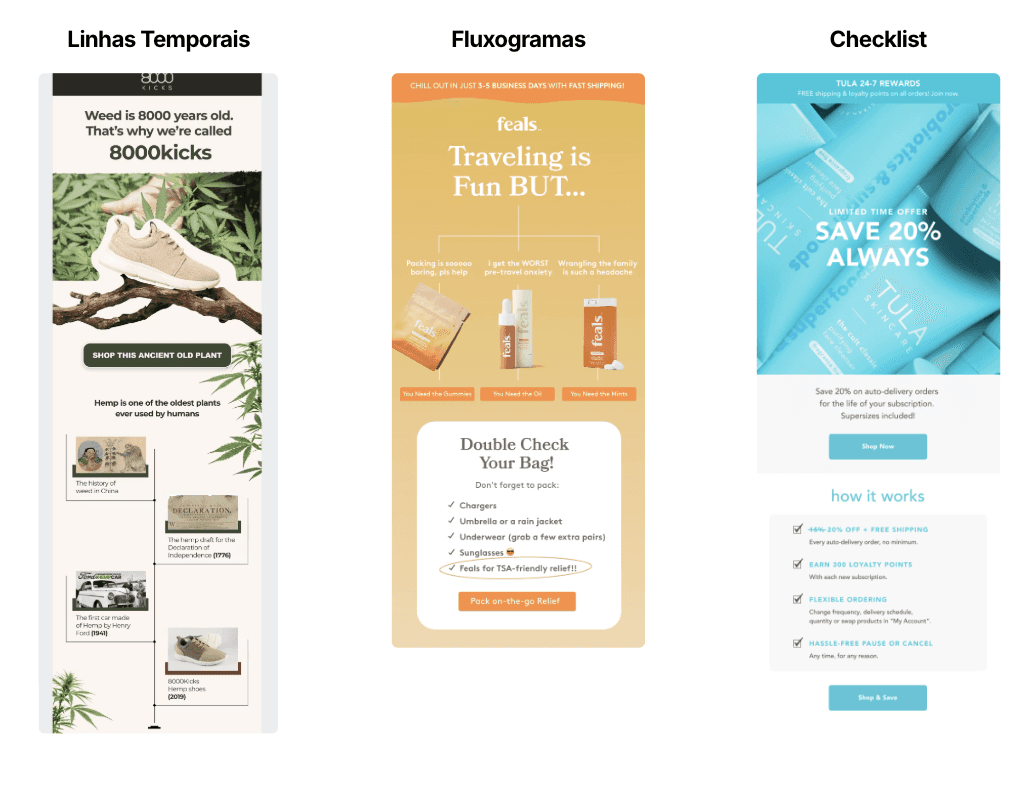 Linhas Temporais – Ajudam a explicar a história de uma marca ou um processo específico - como o tempo de envio ou as etapas para atingir um determinado objetivo.