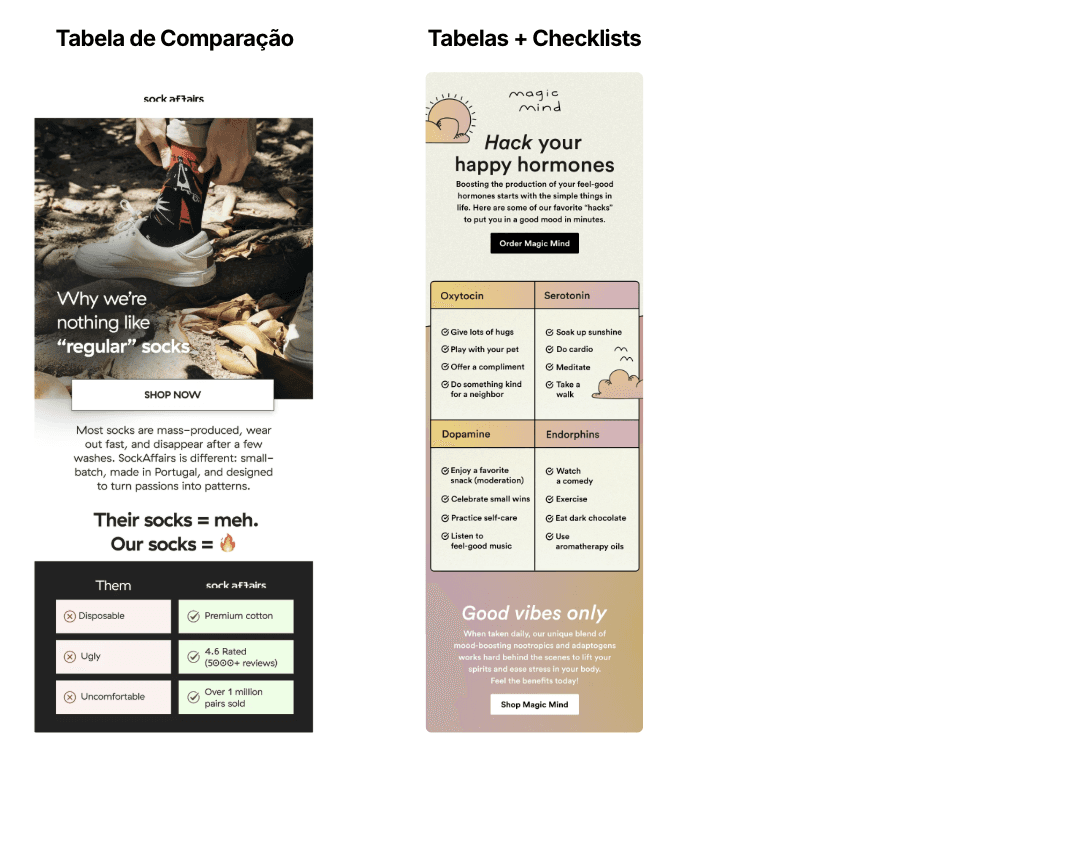 Tabelas – Úteis para comparar detalhes como preços ou especificações de produtos.